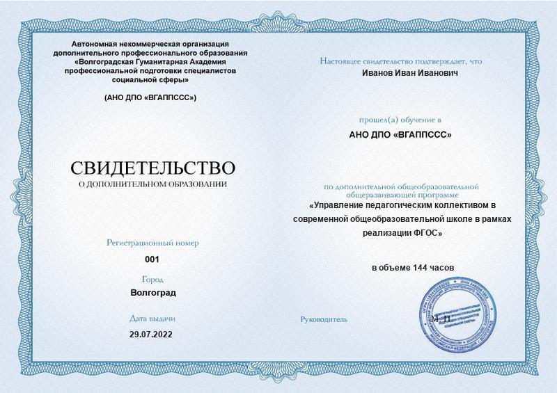 Управление педагогическим коллективом в современной общеобразовательной школе в рамках реализации ФГОС (144ч)