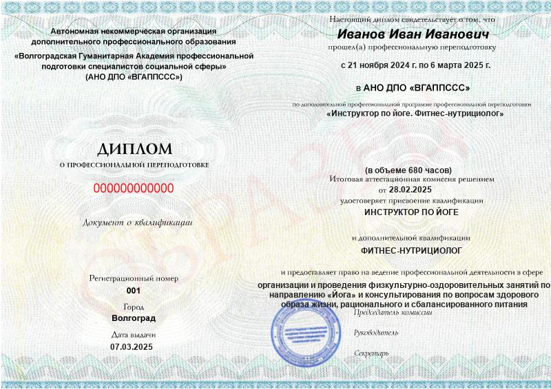 Обучение по такой программе – способ освоить новую профессию на основе ранее полученного образования. В дипломе выпускника указывается его ФИО, наименование учебной организации, название и длительность программы. Документ заверяется подписью руководителя и печатью АНО ДПО «ВГАППССС».