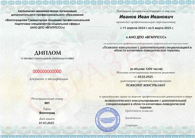 Обучение по такой программе – способ освоить новую профессию на основе ранее полученного образования. В дипломе выпускника указывается его ФИО, наименование учебной организации, название и длительность программы. Документ заверяется подписью руководителя и печатью АНО ДПО «ВГАППССС».