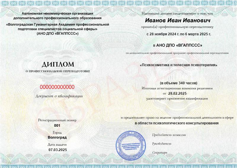 Обучение по такой программе – способ освоить новую профессию на основе ранее полученного образования. В дипломе выпускника указывается его ФИО, наименование учебной организации, название и длительность программы. Документ заверяется подписью руководителя и печатью АНО ДПО «ВГАППССС».